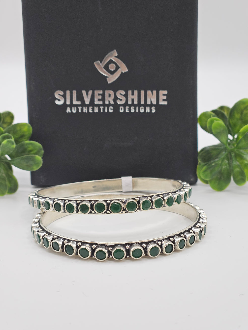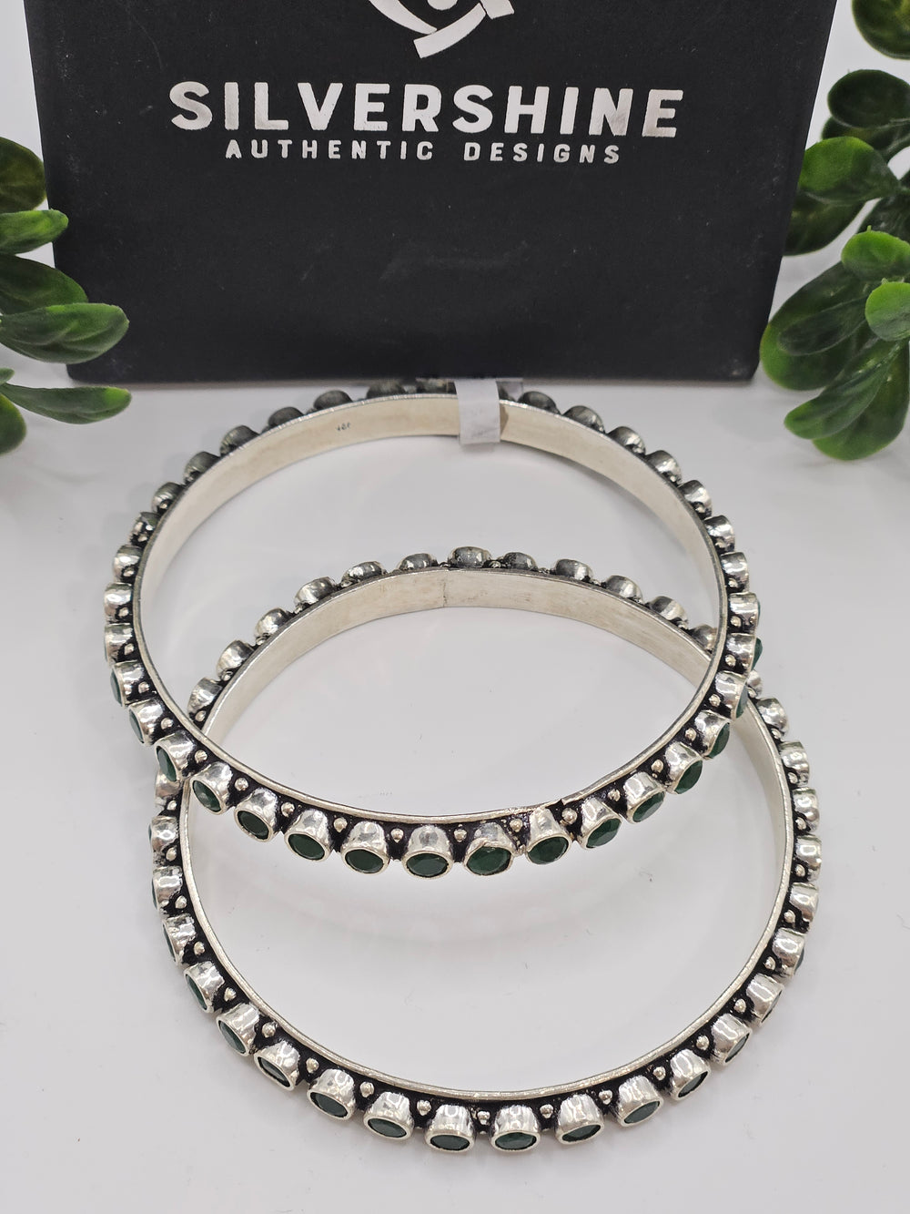 Elegant Statement Oxidized silver 2 bangles in pair with Semi precious emerald Stones