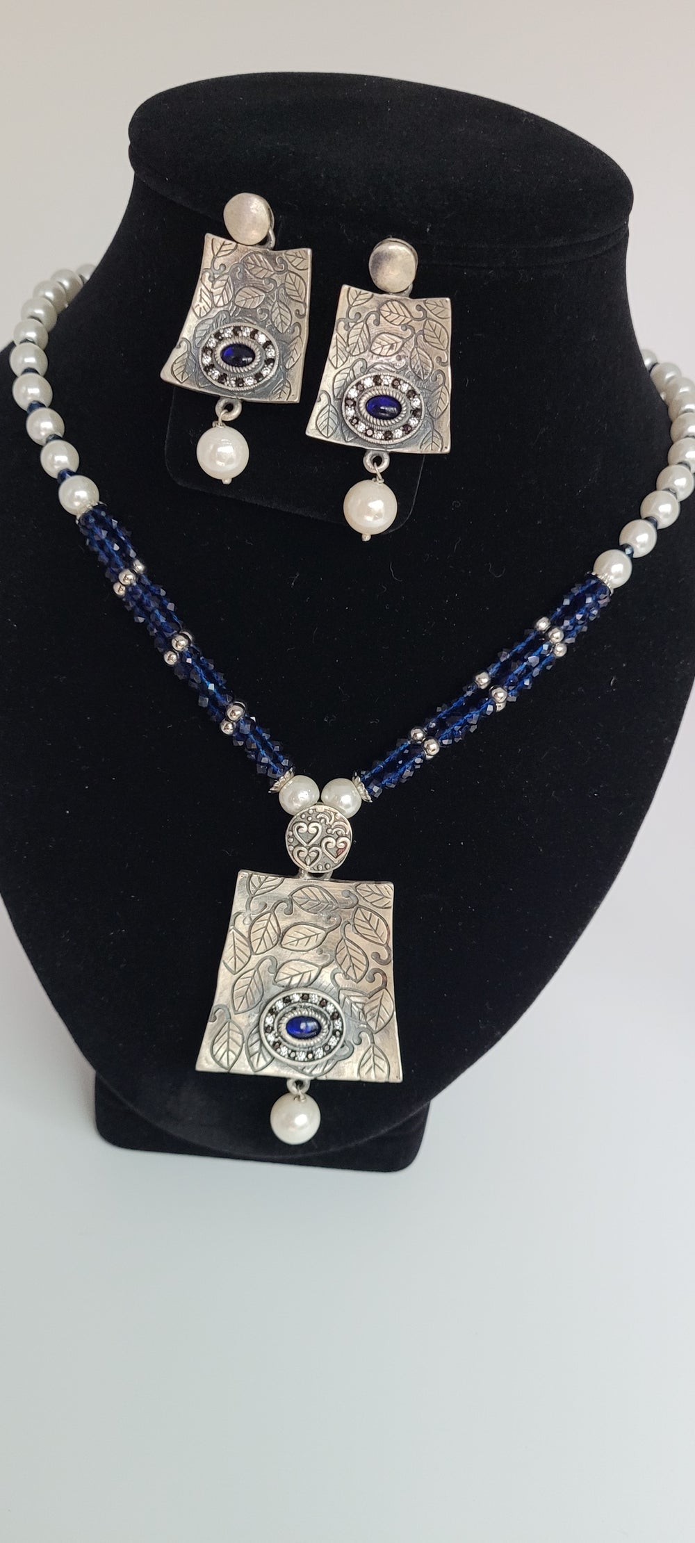 Hand crafted in Sterling Oxidized finish Square Blue Stones Necklace with earring gives a graceful look with pearls & Blue beads surrounded to neck piece.