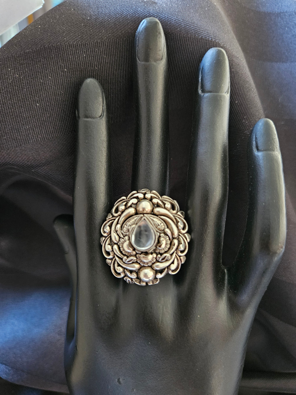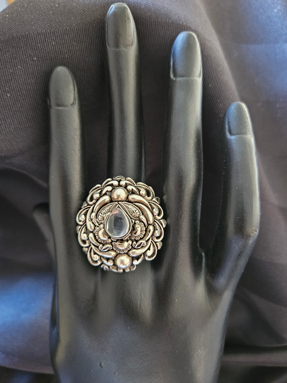 Elegant Statement Silver Adjustable Medium white kundn ring gives elegant looks to its own.
